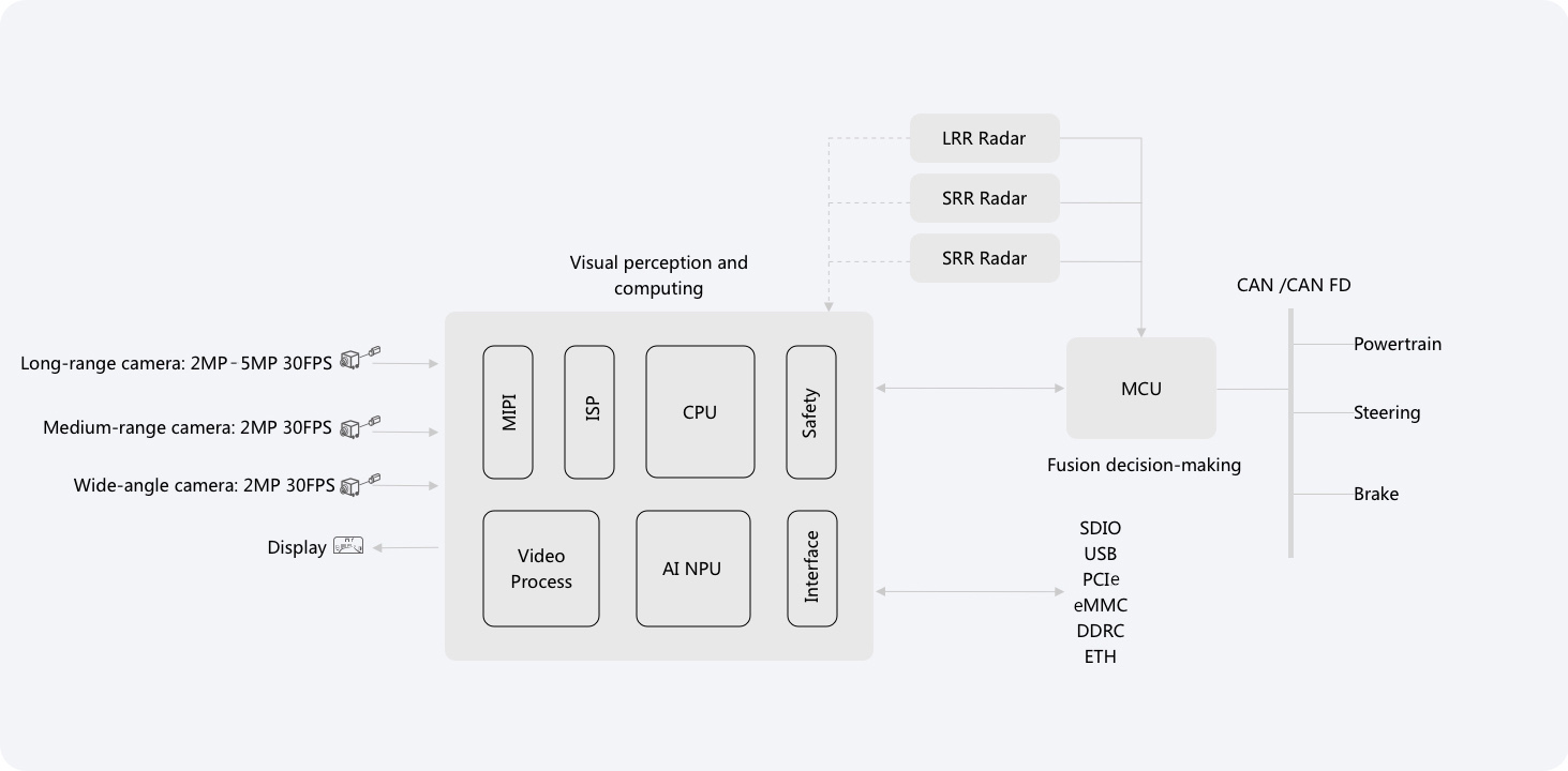 The HiSilicon ADAS solution provides a range of high-performance heterogeneous computing units, including the network processing unit (NPU), digital signal processor (DSP), intelligent video engine (IVE), data processing unit (DPU), and CPU. With the 24/7 image signal processor (ISP) and the 4K camera system (single-, dual-, and triple-camera systems are supported), our ADAS is able to obtain information from its surroundings, as well as detect and analyze the various traffic participants in real time. Our ADAS then uses fusion and perception to deliver a wide range of functions, including forward collision warnings (FCW), advanced emergency braking (AEB), lane departure warnings (LDW), intelligent speed limit information (ISLI), blind spot detection (BSD), and rear collision warnings (RCW). We will continue to invest in our ISO 26262–compliant chipsets and solutions and improve upon their intelligent compute power and image processing capabilities, to ensure an optimal level of performance.